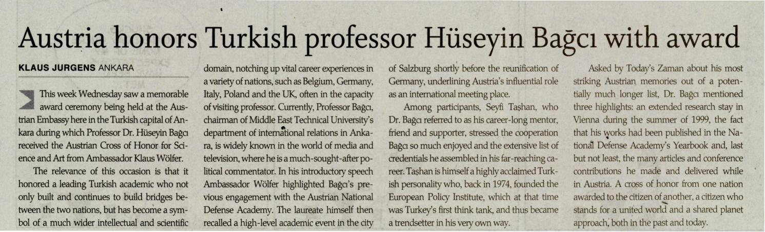 AUSTRIA HONORS TURKISH PROFESSOR HUSEYIN BAGCI WITH AWARD