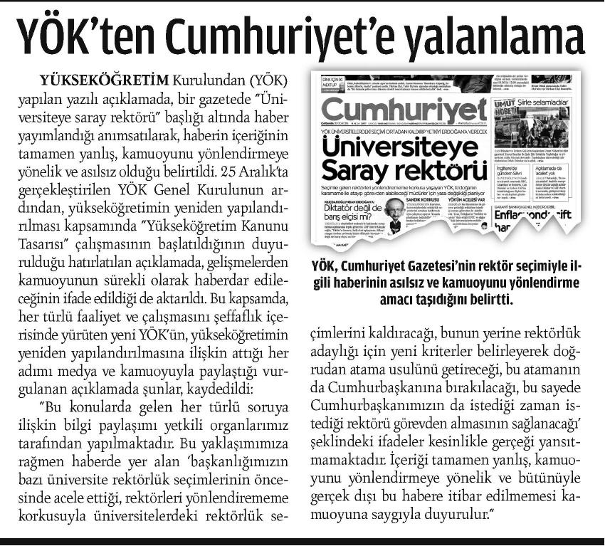YÖK'TEN CUMHURİYET'E YALANLAMA