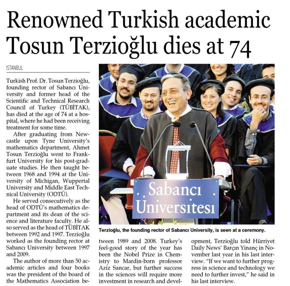 RENOWNED TURKISH ACADEMIC TOSUN TERZIOGLU DIES AT 74