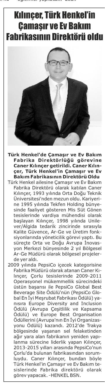 KILINÇER, TÜRK HENKEL'İN ÇAMAŞIR VE EV BAKIM FABRİKASININ DİREKTÖRÜ OLDU