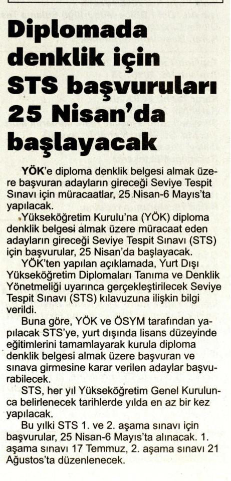 DİPLOMADA DENKLİK İÇİN STS BAŞVURULARI 25 NİSAN'DA BAŞLAYACAK