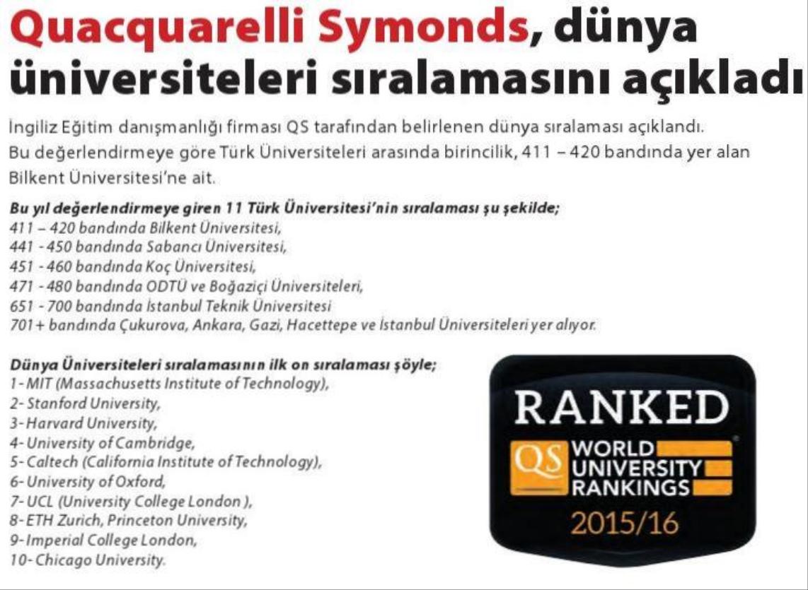 QUACQUARELLI SYMONDS, DÜNYA ÜNİVERSİTELERİ SIRALAMASINI AÇIKLADI