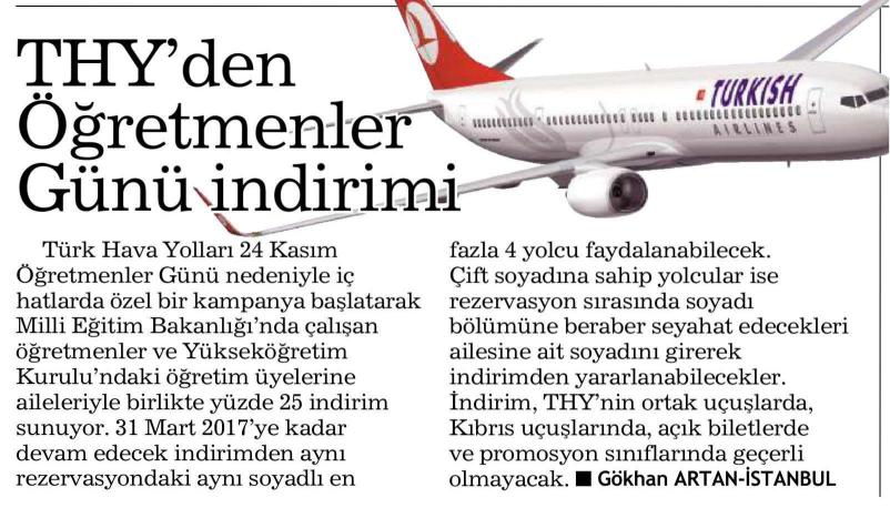 THY'DEN ÖĞRETMENLER GÜNÜ İNDİRİMİ