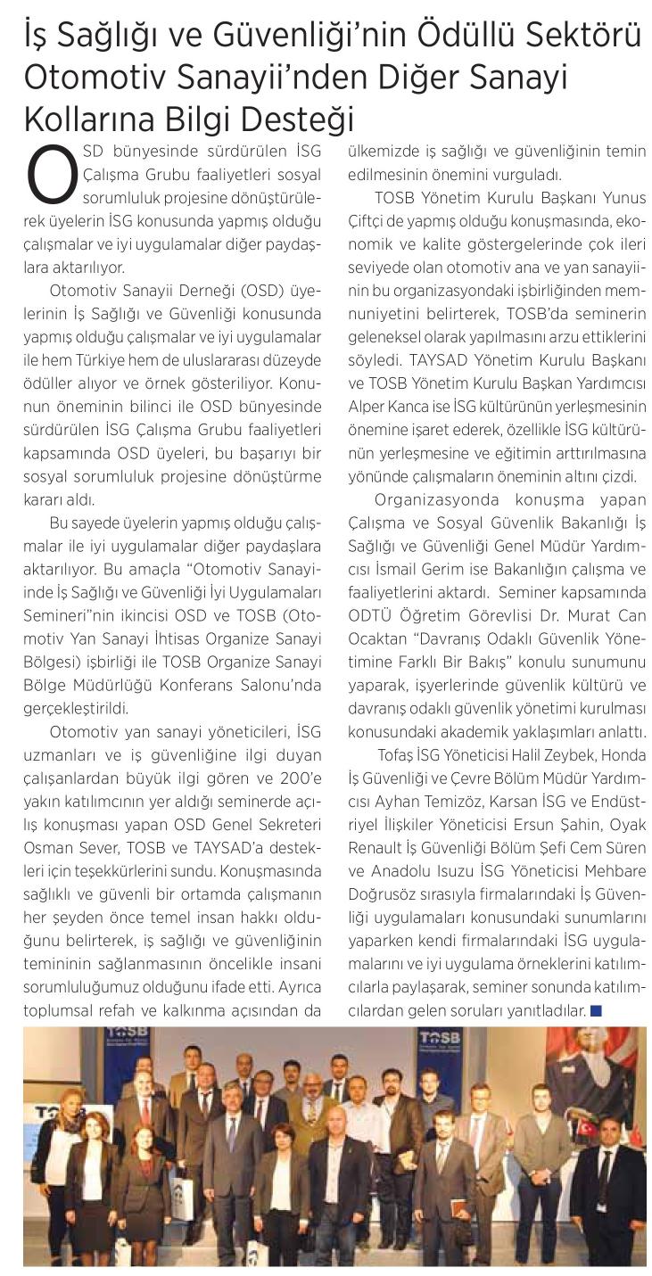 İŞ SAĞLIĞI VE GÜVENLİĞİ'NİN ÖDÜLLÜ SEKTÖRÜ OTOMOTİV SANAYİİ'NDEN DİĞER SANAYİ KOLLARINA BİLGİ DESTEĞİ