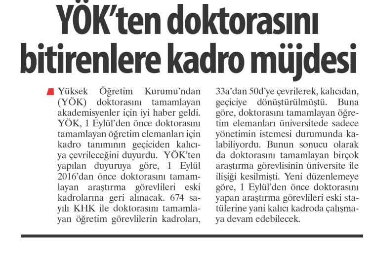 YÖK'TEN DOKTORASINI BİTİRENLERE KADRO MÜJDESİ