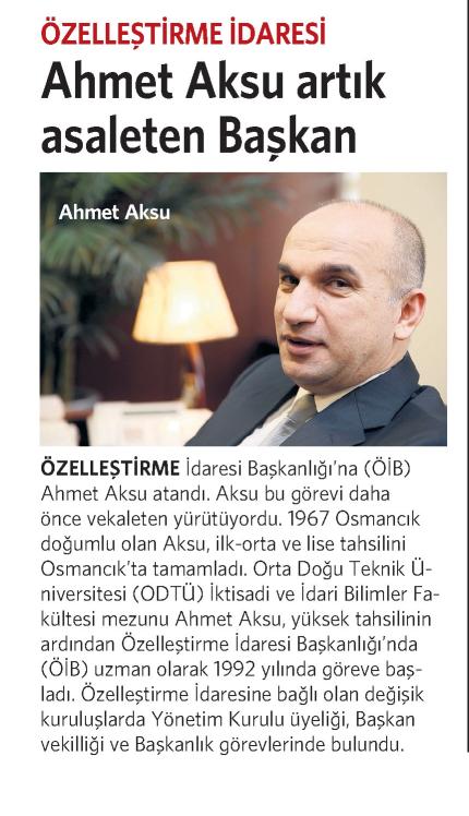 ÖZELLEŞTİRME İDARESİ AHMET AKSU ARTIK ASALETEN BAŞKAN