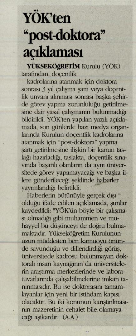 YÖK'TEN "POST-DOKTORA" AÇIKLAMASI