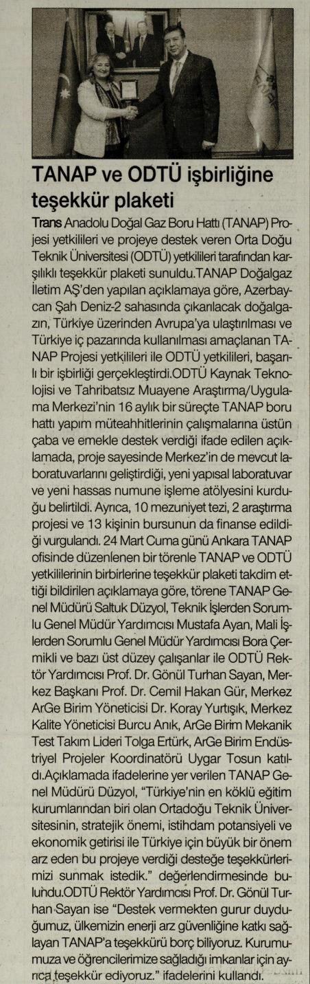 TANAP VE ODTÜ İŞBİRLİĞİNE TEŞEKKÜR PLAKETİ