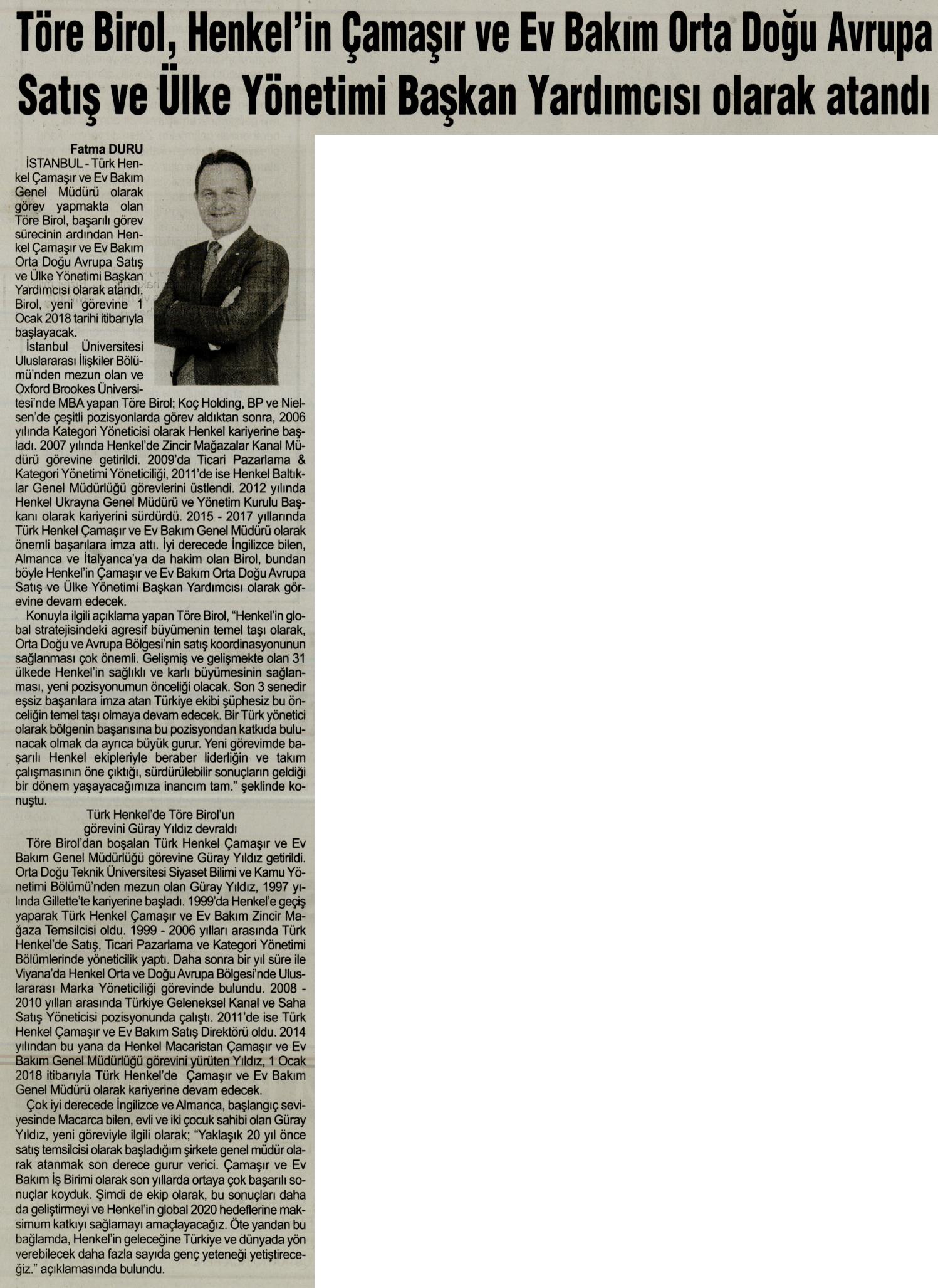 TÖRE BİROL, HENKEL'İN ÇAMAŞIR VE EV BAKIM ORTA DOĞU AVRUPA SATIŞ VE ÜLKE YÖNETİMİ BAŞKAN YARDIMCISI OLARAK ATANDI