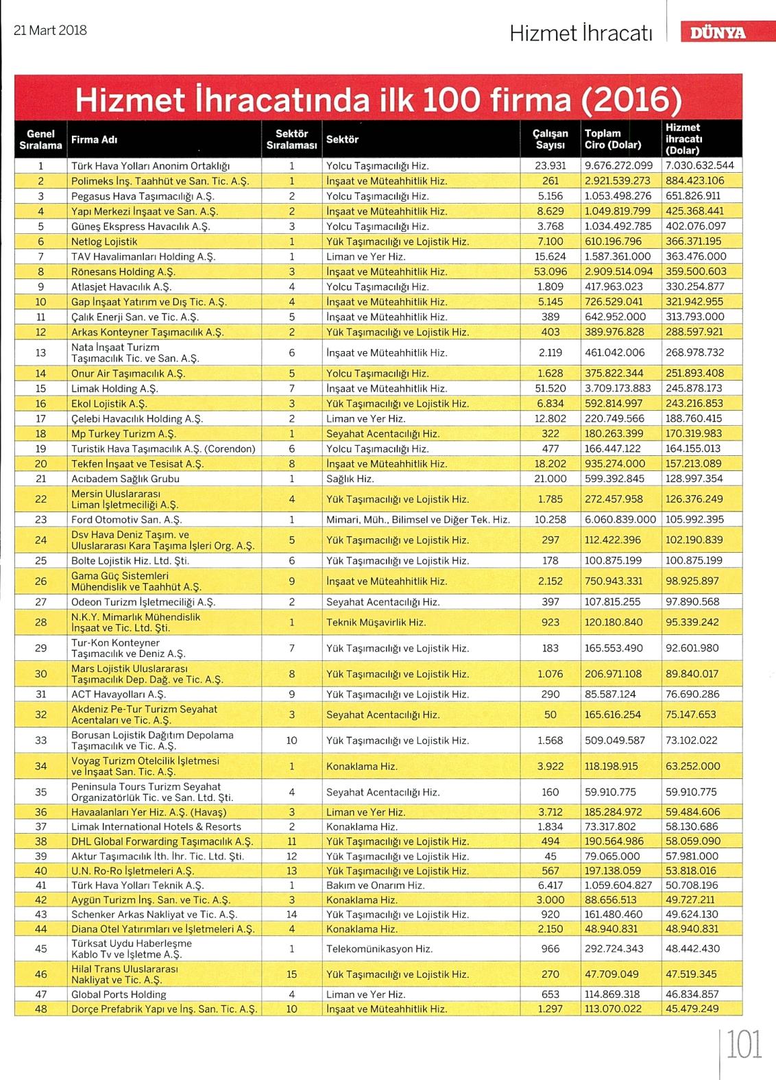 HİZMET İHRACATINDA İLK 100 FİRMA (2016)