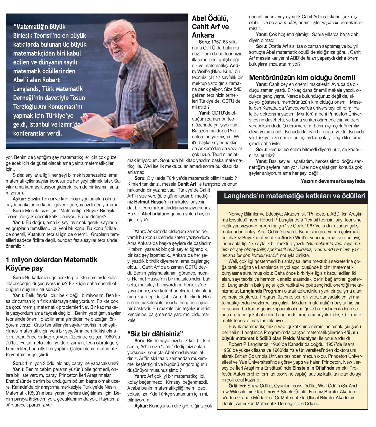 LANGLANDS , ANKARA'DA BAŞLATTIĞI ÇALIŞMALARIYLA ABEL MATEMATİK BÜYÜK ÖDÜLÜNÜ ALDI [Devam - 1]