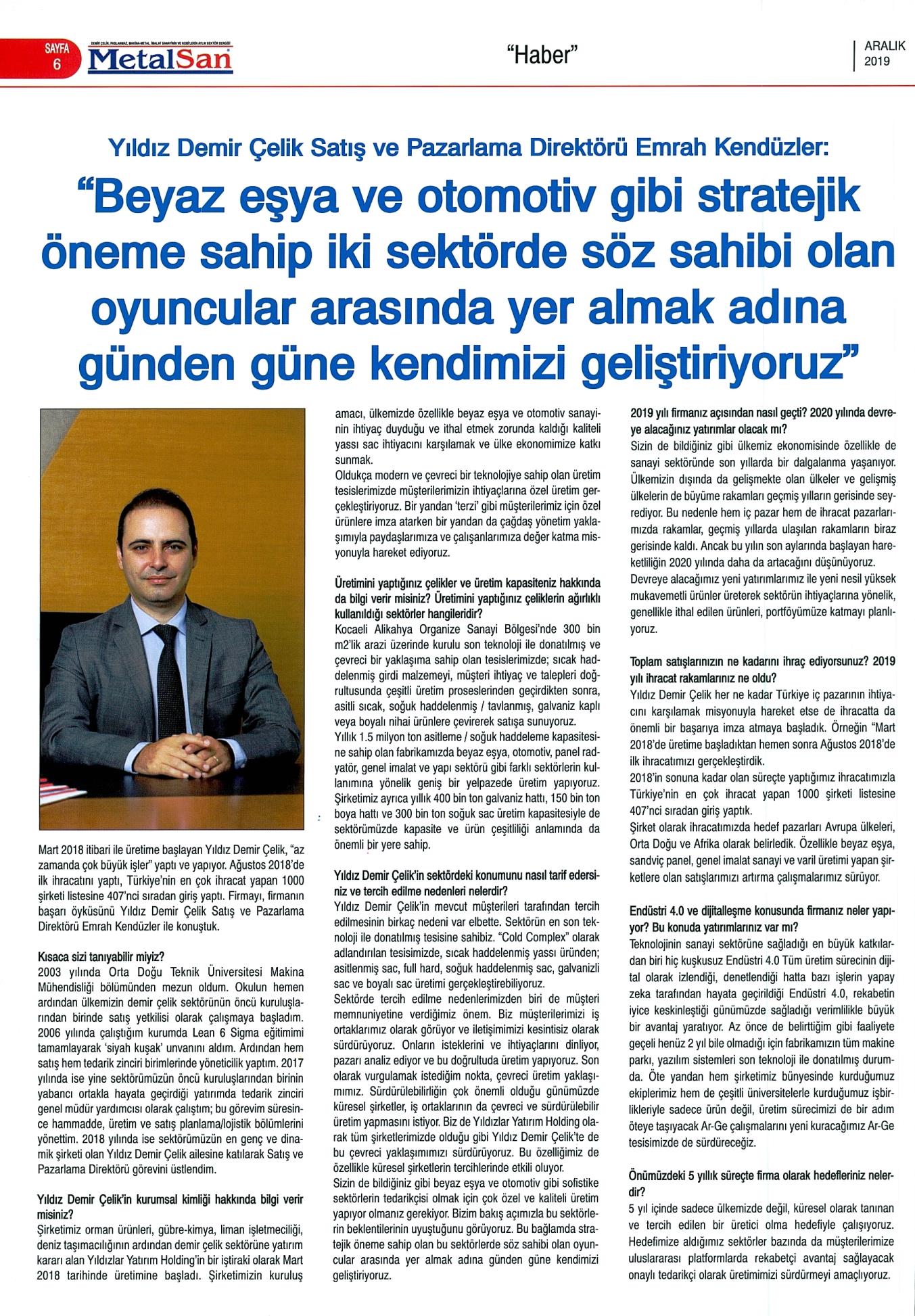 YILDIZ DEMİR ÇELİK SATIŞ VE PAZARLAMA DİREKTÖRÜ EMRAH KENDÜZLER: ''BEYAZ EŞYA VE OTOMOTİV GİBİ STRATEJİK ÖNEME SAHİP İKİ SEKTÖRDE SÖZ SAHİBİ OLAN OYUNCULAR ARASINDA YER ALMAK ADINA GÜNDEN GÜNE KENDİMİZİ GELİŞTİRİYORUZ''