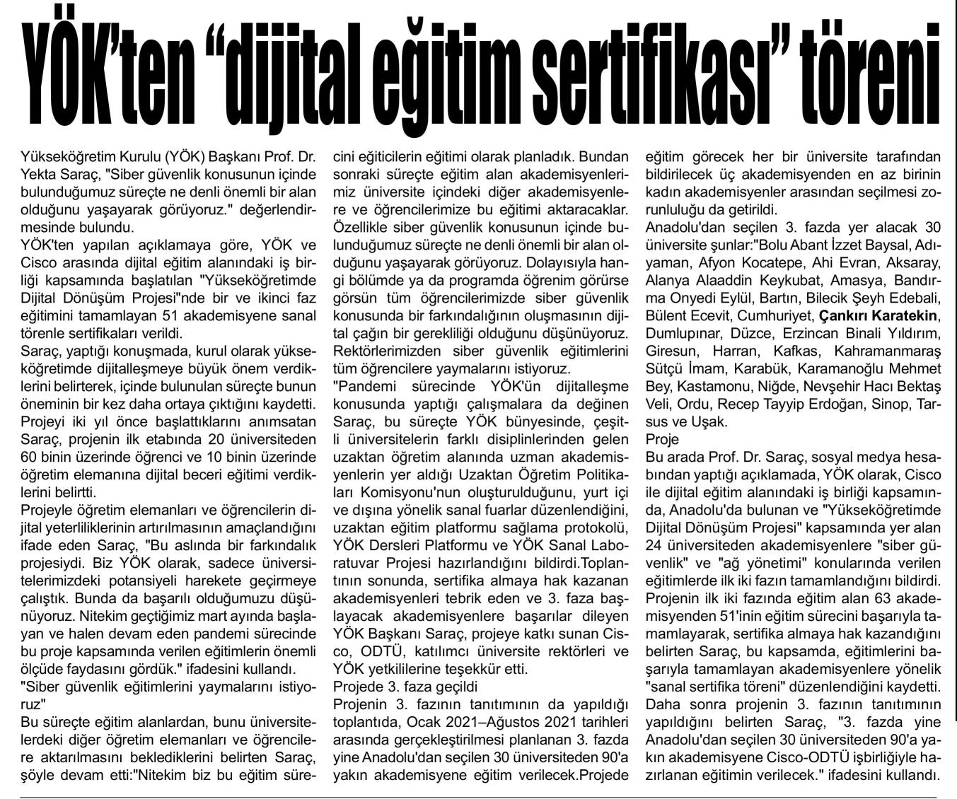 YÖK'TEN DİJİTAL EĞİTİM SERFİTİKASI TÖRENİ