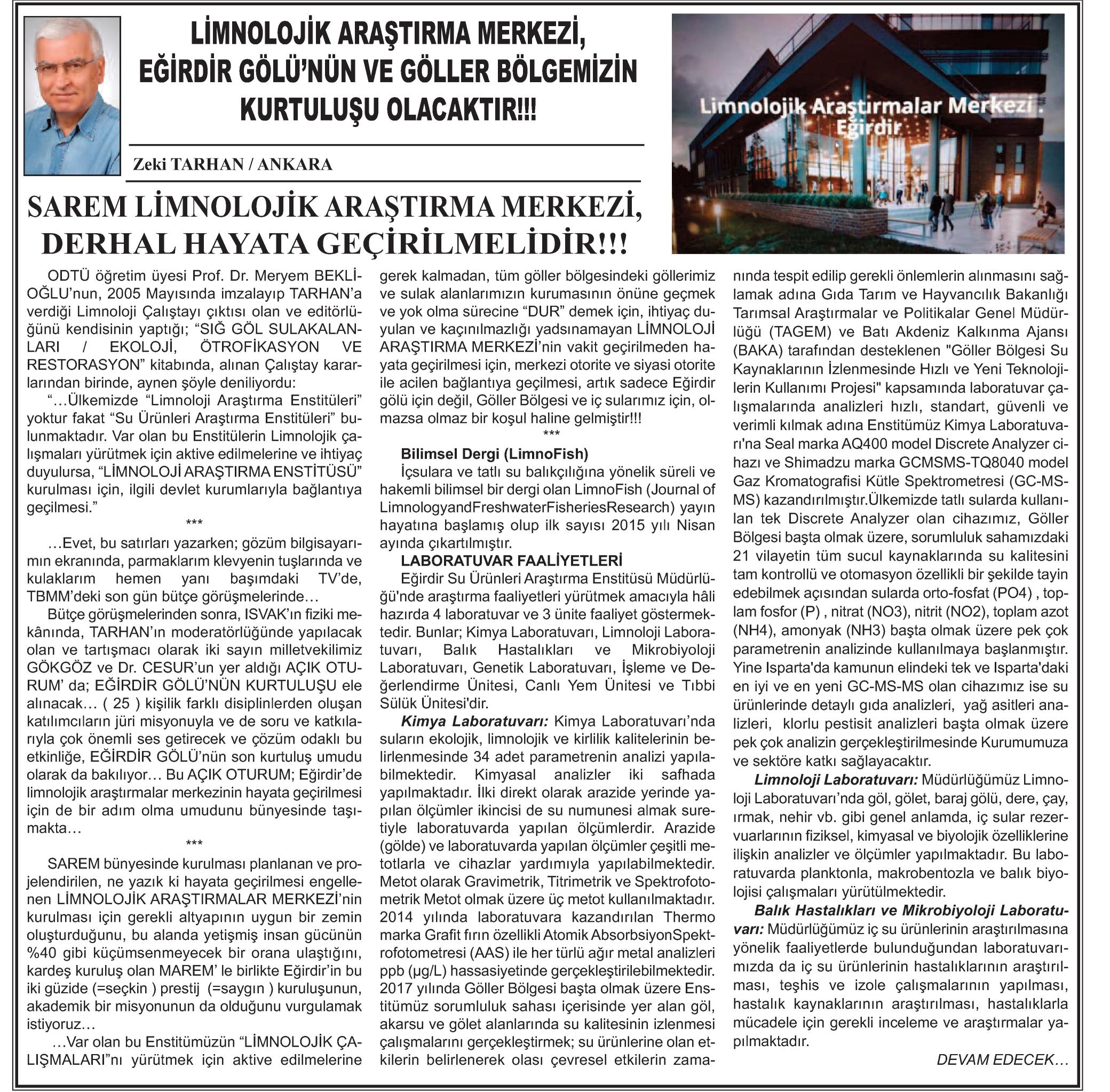 LİMNOLOJİK ARAŞTIRMA MERKEZİ, EĞİRDİR GÖLÜNÜN VE GÖLLER BÖLGEMİZİN KURTULUŞU OLACAKTIR