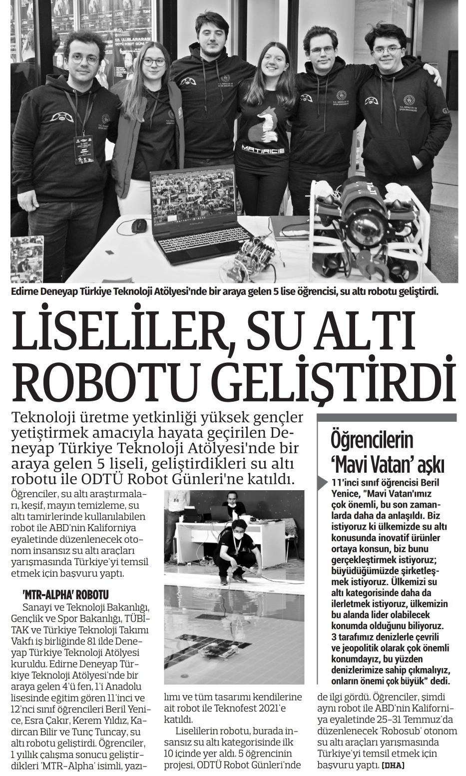 LİSELİLER, SU ALTI ROBOTU GELİŞTİRDİ