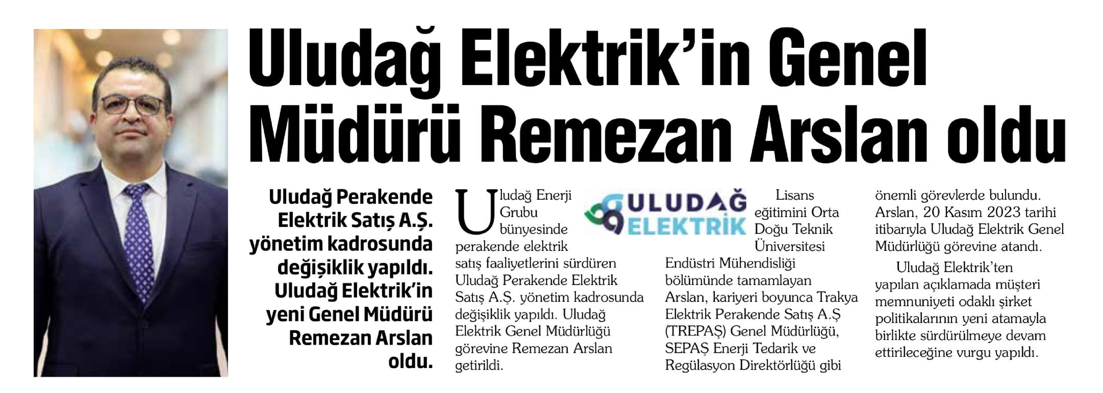 ULUDAĞ ELEKTRİK'İN GENEL MÜDÜRÜ REMEZAN ARSLAN OLDU