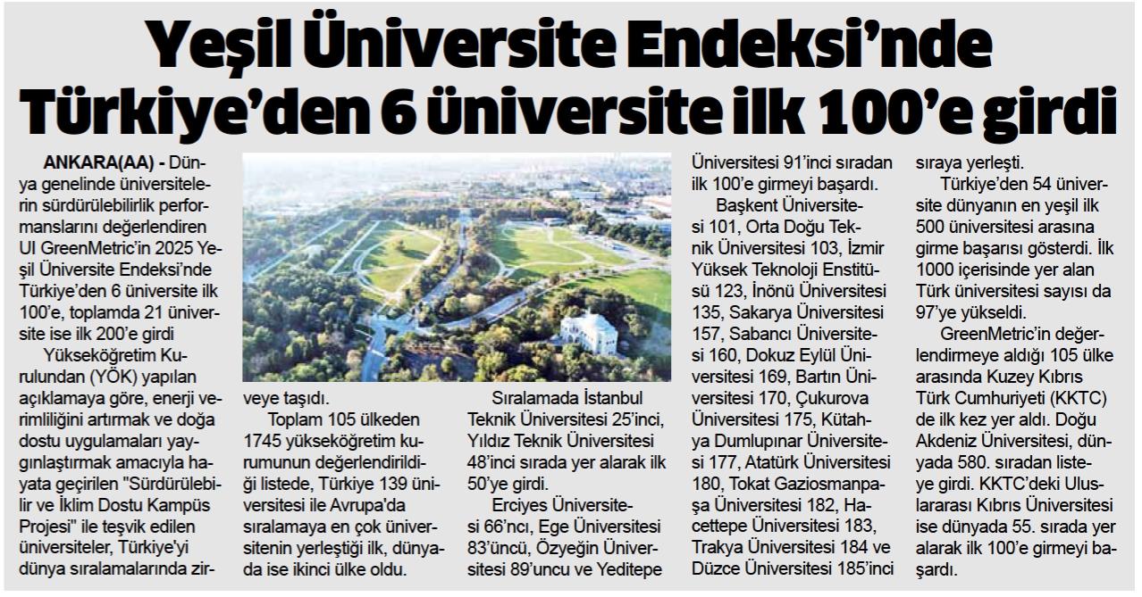 YEŞİL ÜNİVERSİTE ENDEKSİ'NDE TÜRKİYE'DEN 6 ÜNİVERSİTE İLK 100'E GİRDİ