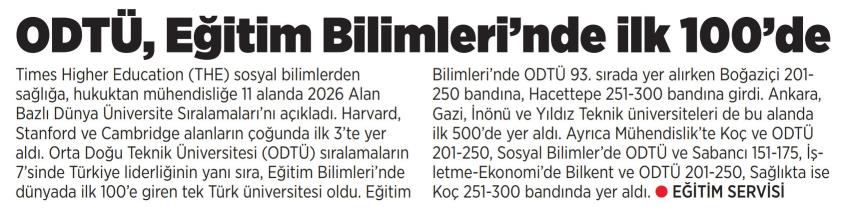 ODTÜ, EĞİTİM BİLİMLERİ'NDE İLK 100'DE