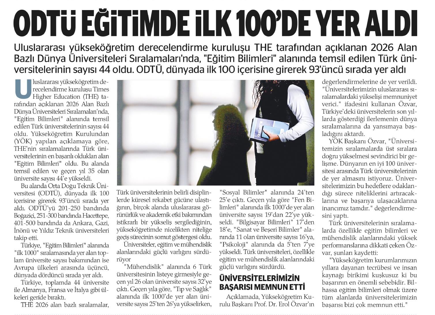 ODTÜ EĞİTİMDE İLK 100'DE YER ALDI