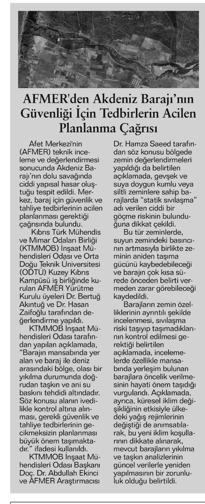 AFMER'DEN AKDENİZ BARAJI'NIN GÜVENLİĞİ İÇİN TEDBİRLERİN ACİLEN PLANLANMA ÇAĞRISI